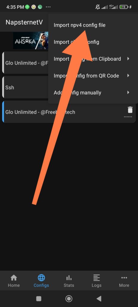 - Select Import npv4 Config File then click on the Glo Unlimited Configuration File you downloaded previously.